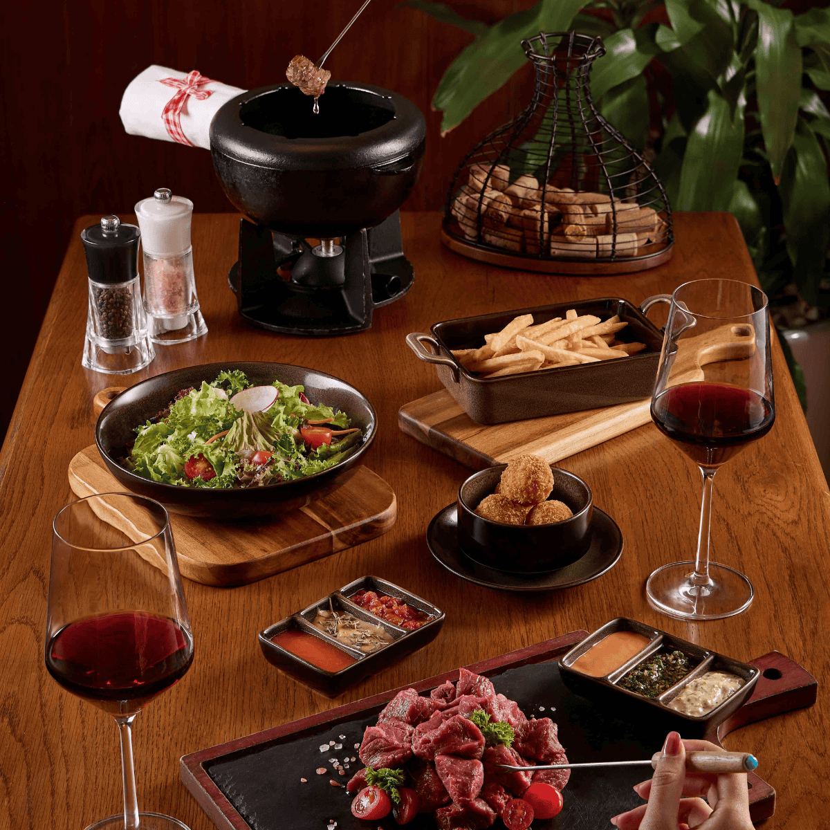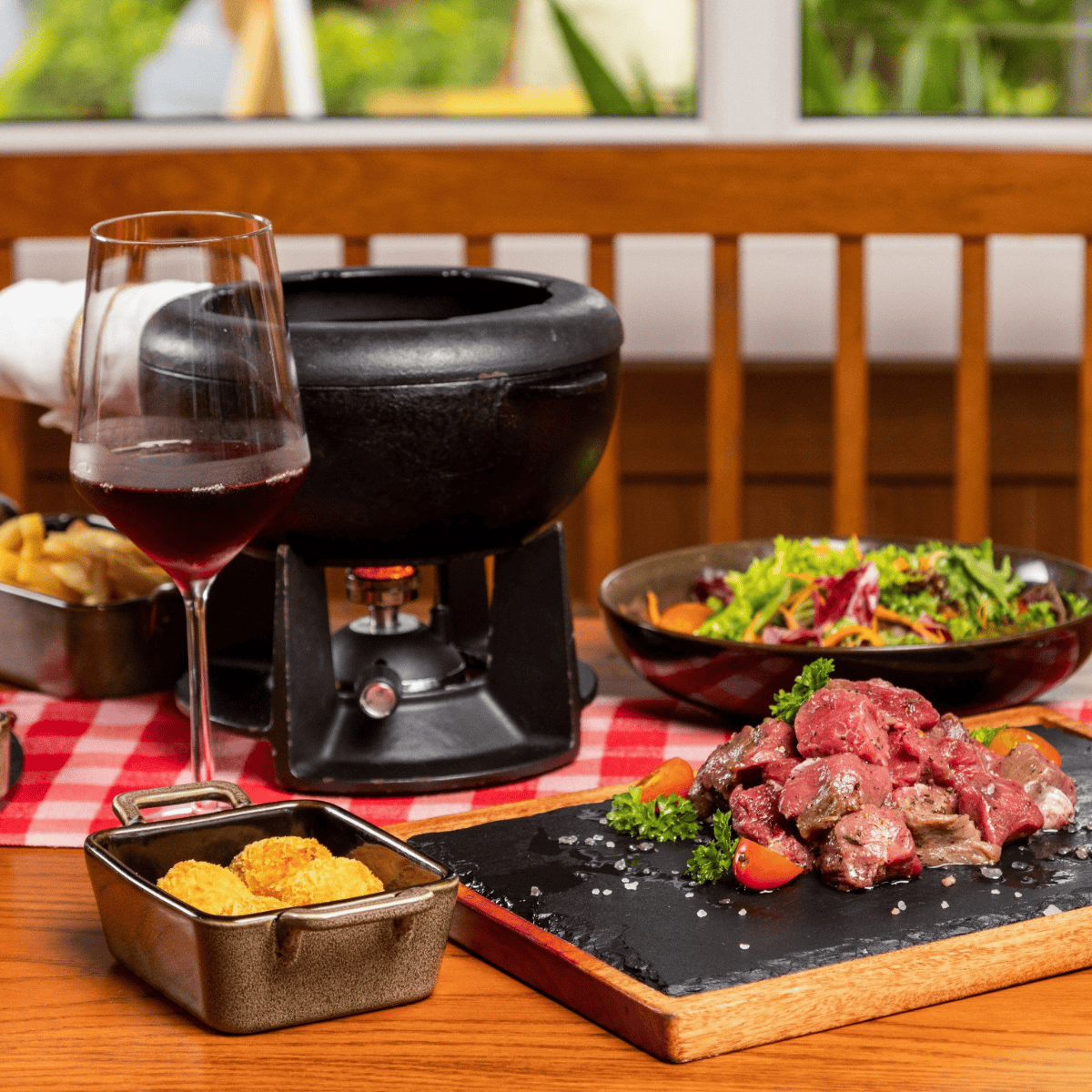Наше Швейцарское говяжье фондю состоит из отборного филе аргентинской говядины, которое идеально подходит для подачи с нашими 2 бесплатными бокалами красного вина.